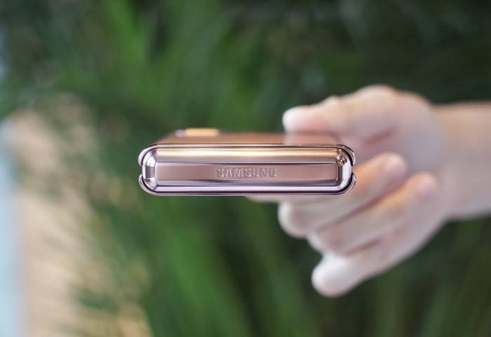 筆者手裡的這臺迷霧金的配色,乍一看似乎是玫瑰金與古銅色的結合,極盡奢華卻又低調的磨砂質感搭配同色系金屬外邊框,再配合鉸鏈開合展開的“SAMSUNG”中置金屬LOGO以及翻蓋小巧的整體機身,攜它走在街上真是完全令人眼前一亮,極具差異性與奢華感。而筆者作為一個女生,更是對它“粉餅盒”的精緻設計以及磨砂質感的迷霧金色感到欲罷不能。