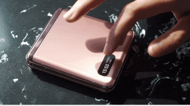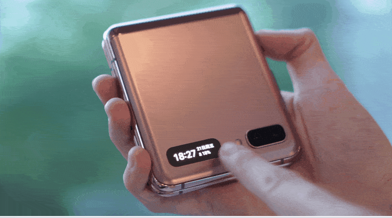 此次三星Galaxy Z Flip 5G或許是考慮到縱向摺疊,機身小巧,面積有限,並致力於小巧精緻的設計,三星這次沒有在手機外部使用大塊 AMOLED,而是用了一塊 1.1 英寸的 Super AMOLED 來當資訊視窗,這讓筆者不禁想起了當年的翻蓋手機,也正是採用了機身外部配備一塊小視窗螢幕的設計。這一元素更加印證了三星對早年翻蓋手機的復興與創新。