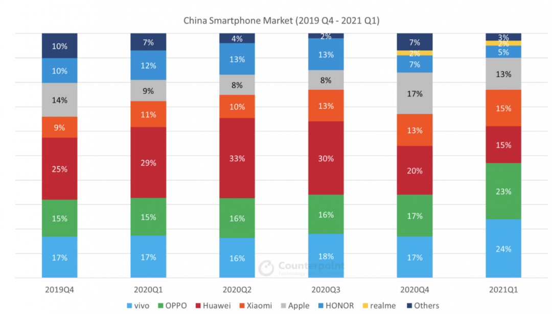 CounterpointResearch 指出,2021 年第一季出貨佔比最高的為三星達到 22%,其次為蘋果 iPhone 落在 17%,後續則為小米(14%)、Oppo(11%)、Vivo(10%),昔日曾經衝上前三名的華為現在只剩下 4%。